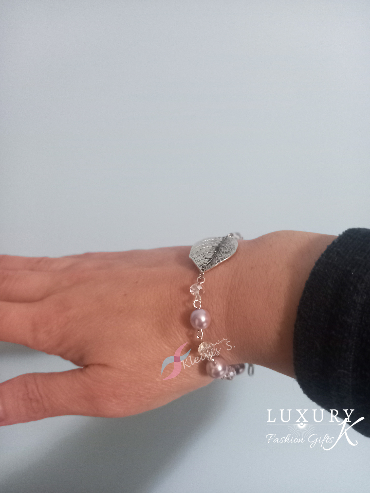 Bracelet with antique pink Pearls, Transparent stones & Alumni Leaves.