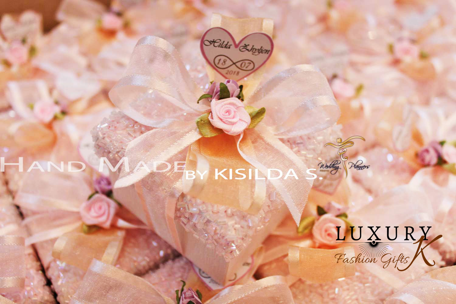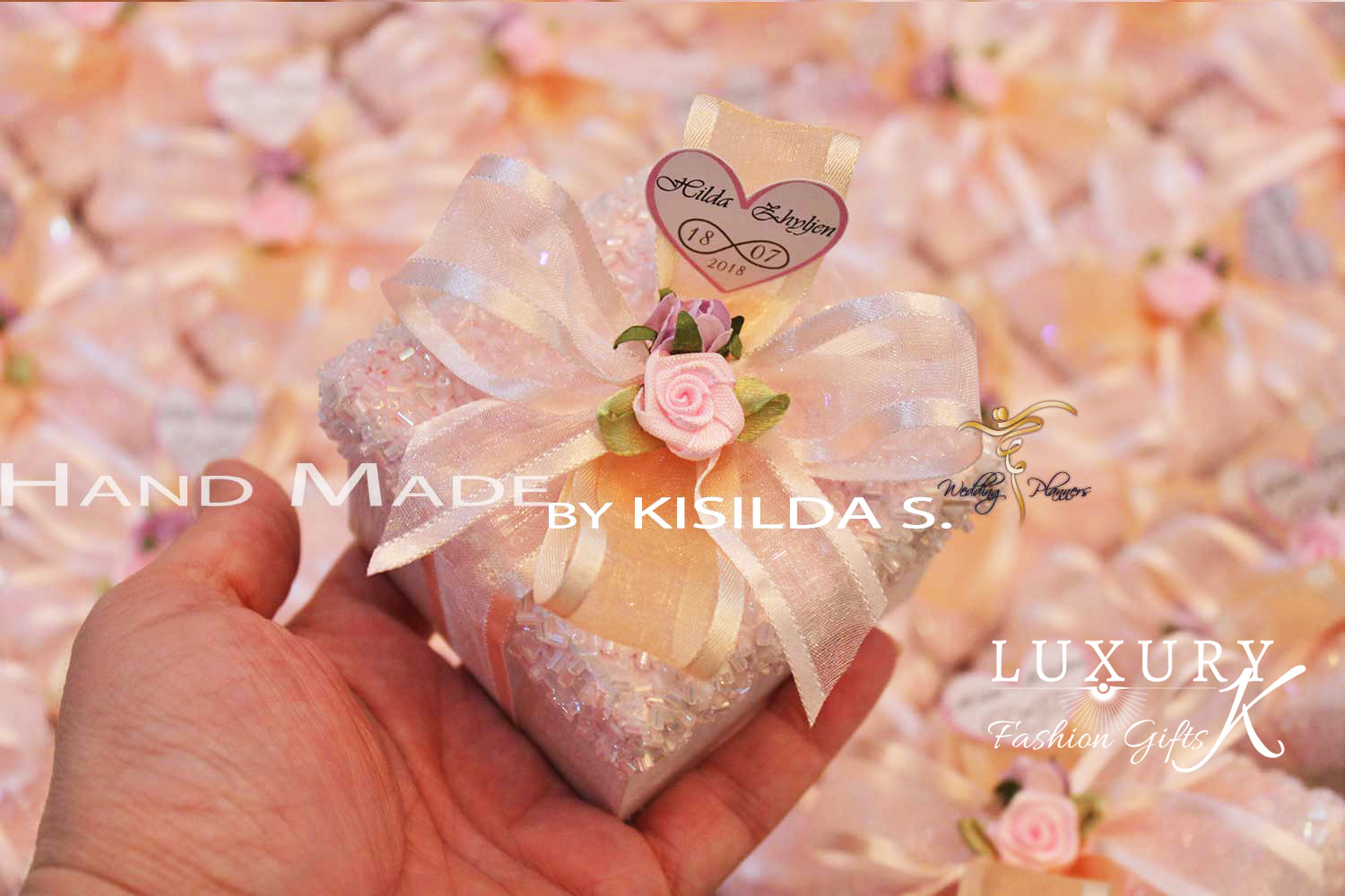 Confetti box with lid decorated with organza ribbons and satin and paper flowers. The box is perfect for an event that loves sweet colors..